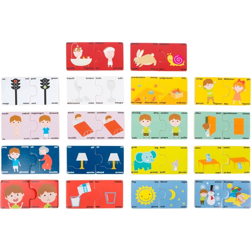 Avec ce beau puzzle éducatif en bois, les enfants apprennent les contraires tout en jouant. En tout, 18 faits représentés par de belles images attendent de trouver leur paire. Avec ce puzzle, on peut également jouer au Memory.