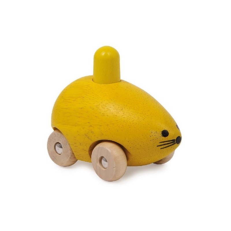 Cette adorable souricette en bois de hêtre lasuré sur roulettes de bois couine gaiement quand on appuie sur le piston en bois !